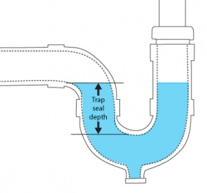 First, a quick description of how a sewer system works: There are a series of pipes below the floor of a building with plumbing fixtures within it that carry all the wastewater away to a septic tank or municipal sewer connection. As you probably already know, a sewer system and septic tank have strong odors in them and harbor gases and bacteria that are harmful to humans. These pipes are also connected to a vent system that helps to maintain equal pressure within the sewer system and to allow for sewer gases to escape to the atmosphere. The vent system should never have water flowing through it under normal conditions. The vent pipes extend above the drains in the walls and attic of a building and terminate above the roof. Oftentimes, multiple vents connect into one main vent stack to eliminate the need for multiple roof penetrations. A separation on any part of the vent system or the sewer system can allow for sewer gas to leak out into the building. If a break occurs on a drain pipe and not a vent, then the waste can also leak out, depending on where the separation is specifically. The other part of this system is the p-traps that keep from sewer gas escaping into the room they are located. A p-trap is a specially designed pipe that traps a specific level of water inside and is attached to a plumbing fixture, usually directly below the outlet of the fixture. All plumbing fixtures that connect to the sewer system must do so via a p-trap. Because the p-trap connects the fixture to a sewer system and the fixture is inside a building, there has to be a way to stop from the gases escaping into the building. This is accomplished with a p-trap that traps water in the pipe at a low point within it and stops the flow of sewer gases from escaping from the system. This only works if water is inside the p-trap and has not evaporated. See images below for a reference of a p-trap.