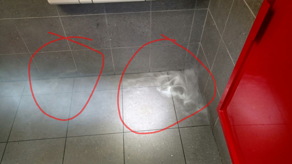 Then, through the access point used to plug the sewer for filling, we make a mark to see where the water is and watch it for 15-20 minutes to see if it drops below our mark and where it stops. This is for testing only the drains below the floor. A side note: a sewer gas leak on the sewer below a slab can be bad enough to where a smoke test will expose it. I have personally seen this and have the photos showing the result below.