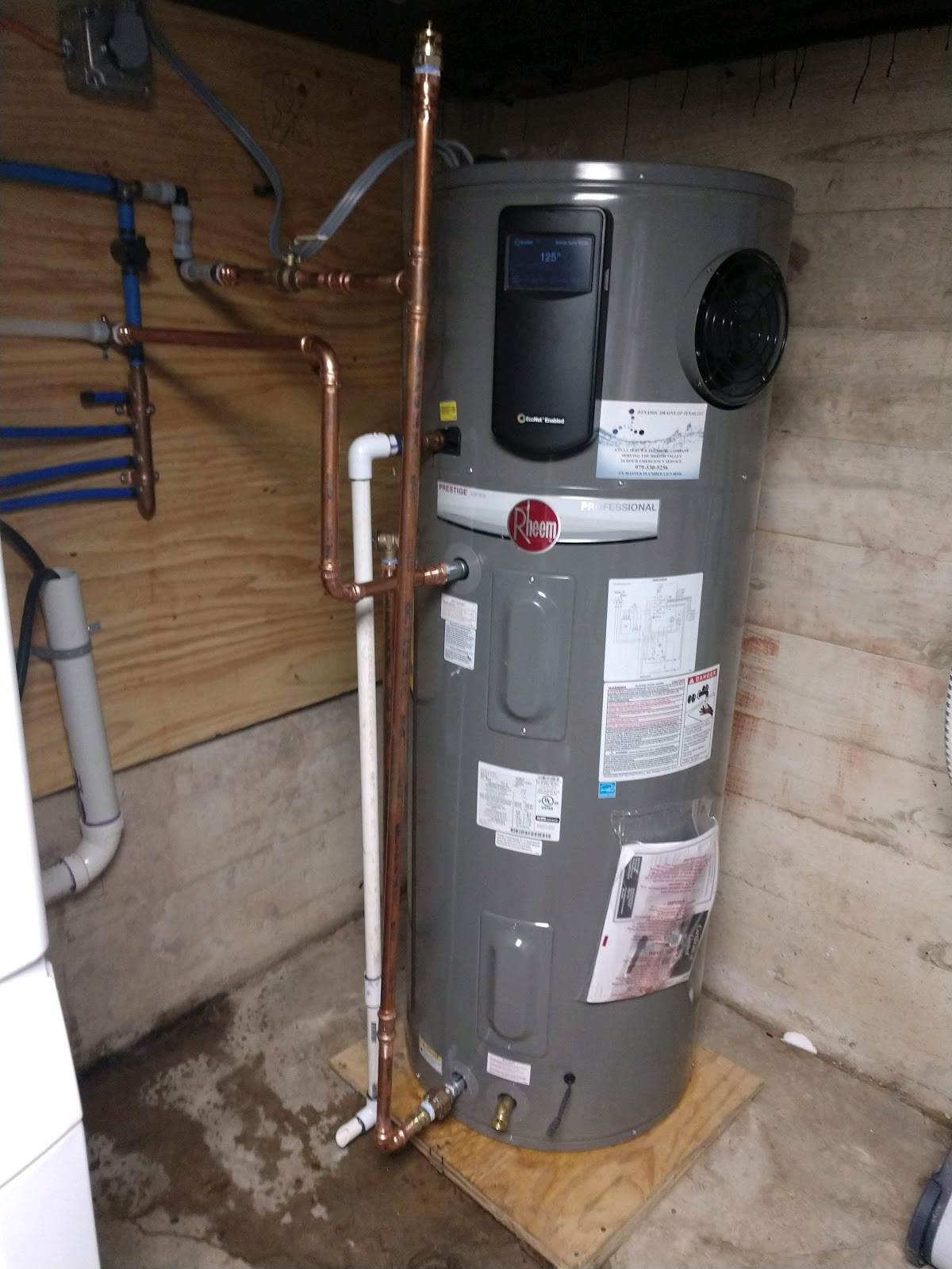 Yes! A new water heater on the market called a hybrid water heater made by Rheem Manufacturing has really improved efficiency for electric water heaters. A hybrid electric water heater uses a compressor that is enclosed within the unit to pull in hot air to heat the water with a heat exchanger coil inside the tank. Essentially, it pulls in hot air, such as from an attic or other space, uses that hot air to transfer to the water, and blows out cool air after transferring the heat to the water. It acts like a small air conditioning unit that sits on top of the water tank. There are heating elements attached to the tank to heat the water but the heat transfer of the compressor and heat exchanger supplement it. This is a great option for hotter climates. If the water heater is located in an air conditioned room, there is duct work available that attaches to the unit and can be installed to pull hot air from a different area like an attic or garage. This also means it can blow the cooler air to a preferred location such as a garage or utility room. If the water heater is located in an attic or other non air conditioned space, no duct work is necessary since it can simply pull from the area the water heater is located. The manufacturer claims that the efficiency of these units can be as high as 3.5 EU (Energy Units). What this means is that it exceeds 100% efficiency and can now save you $3.50 for every dollar spent on energy. It does this by using the heat from the surrounding area combined with the heating elements Obviously, during the cooler times of the year the energy efficiency will not be as high. These units require a 110 volt electrical outlet and a place for the condensation drain to run to since they work like an air conditioner so they produce condensation every time the compressor runs. These units are more expensive than traditional water heaters but the efficiency is great. See photos below for how these units look after installation or give us a call for a consultation.