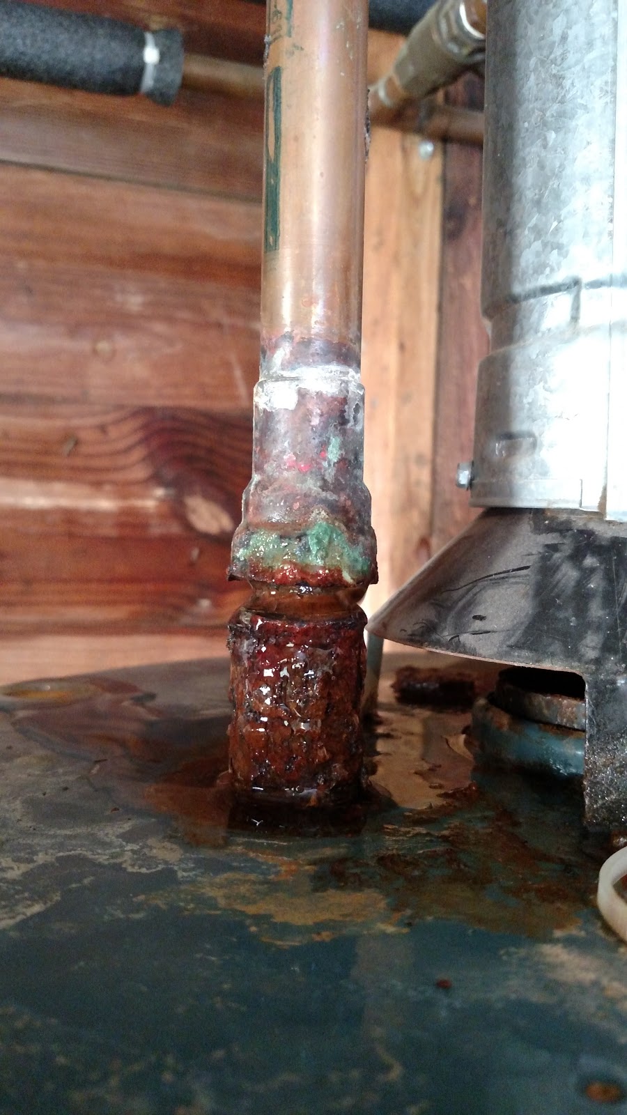 A common sight for a service plumber: a leaking water heater that has been slowly leaking for some time but went unnoticed by the owner.